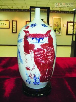 青花釉里紅瓶《靜觀》高56厘米,所繪貓頭鷹高瞻遠(yuǎn)眺,凝神靜矚,濃艷醒目,充滿了浪漫的意韻和情趣。瓷塑《田園衛(wèi)士》高24厘米,以泥餅成型工藝制作,表現(xiàn)一只貓頭鷹雙目炯炯有神,正等候鼠類等壞物的出現(xiàn),一副毫不懈怠、百倍警惕的神態(tài)。作品渾然天成,洋溢原始韻味,粗獷大氣。