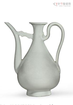 眾所周知,甜白釉以明代永樂窯生產(chǎn)的最為著名,素有“白如凝脂,素猶積雪”之譽(yù)。本次春拍瓷器專場中,一件明代永樂“甜白釉暗刻花卉紋把壺”,堪稱精品之冠。壺身呈玉壺春瓶式樣,腹一側(cè)設(shè)長彎流,另一側(cè)置曲形柄,器型線條復(fù)雜多變,雍容秀美。通體施白釉,溫潤潔凈,釉下細(xì)線錐刻花紋,氣韻流暢,盡現(xiàn)永樂御瓷纖巧柔美之風(fēng)姿。