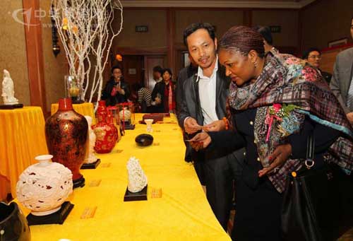 走出國(guó)門赴南非展覽一圖為南非自由省州公共事業(yè)部部長(zhǎng)Sisi Mabe觀賞明玉瓷