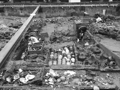 截至目前,考古發(fā)掘深度100厘米至180厘米,發(fā)掘清理土方共計(jì)400多立方米(約800噸)以及移除部分凝結(jié)物。出土小件器物瓷器標(biāo)本623件,漆木器11件、銅錢95組(5000余枚)、金器107件、殘損標(biāo)本2100多件,少量動(dòng)植物殘骸。