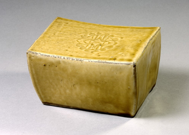 枕為箱形,枕面中部微凹。底留有一圓形通氣孔,黃白色胎土上涂有一層化妝土,體表施晶瑩透亮的黃釉,底未施釉。枕面中央印規(guī)整的菊花紋,器型典雅。唐代壽州窯多為素面,印有花紋的壽州窯瓷器極為珍貴。壽州窯黃釉為高溫黃釉,其著色劑是含少量鐵分的石灰釉,在高溫氧化氣氛中生成三氧化二鐵,呈現(xiàn)黃色!