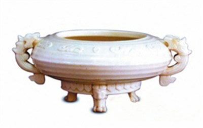 這件白釉瓷雙螭耳三足爐其造型與紋飾雖模仿商周青銅雙螭耳簋式三足爐形制,但形體軒昂,給人以穩(wěn)重勻稱、器型規(guī)整、線條柔和之美感。與古樸的銅雙螭耳簋式三足爐相比,另有一番典雅秀麗的韻味,具有異曲同工之精妙,使人觀之愛(ài)不釋手。白釉瓷雙螭耳簋式三足爐通體施乳白釉,于細(xì)膩潔白色中微微泛黃,瓷簋式爐外底露胎,胎潔白細(xì)膩,整件器物其裝飾在瑩潤(rùn)的釉色中似隱似現(xiàn),既簡(jiǎn)潔生動(dòng),又古樸典雅,給人以溫潤(rùn)寧?kù)o莊重的美感享受。由此可以看出:這件明代德化窯白瓷雙螭耳簋式三足爐,其瓷、胎、釉乃至裝飾藝術(shù)等都達(dá)到了很高的藝術(shù)境界,是一件難得的上乘藝術(shù)精品。