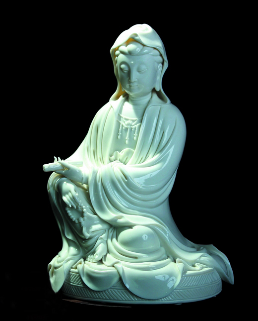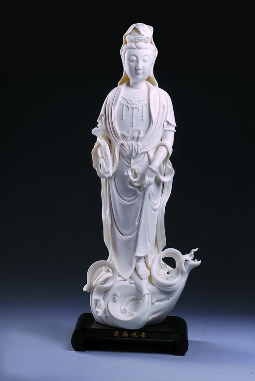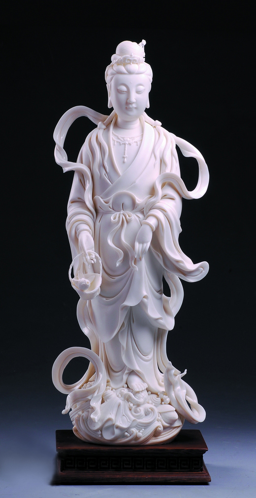 作品《魚籃觀音》便深具林吉祥自己的標簽。觀音赤足站立荷葉之上,下承水浪激涌,胸飾珠串,著通肩衣袍,右手提籃,左手持裙,垂目肅靜安詳。這件作品最引人注目的除了觀音面部的恬靜安詳、氣韻生動以外,還有其周身環(huán)繞的長飄帶。這些長飄帶不但燒制困難,更能充分發(fā)揮出線條對人物造型的重要作用,“以線刻體、以體托線、線體結合”,烘托出人物的精神氣質和內在性格,表現出一種細膩、纖巧的形式美。