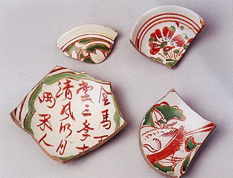 有關(guān)方面1996年曾對長治窯作過詳細調(diào)查和小規(guī)模試掘,近年來也有一些重要發(fā)現(xiàn)。資料表明,11世紀(jì)后期至12世紀(jì)中期以前(金代后期至金亡國或略晚),在長治八義、東山、南泉莊一帶大量燒造以紅綠彩為主的器物,同時燒造白釉黑畫花、黑釉、鈞釉器物和低溫三彩器物。按施彩方法可以分為五類:第一類是在高溫?zé)傻陌椎睾诓蚀缮显偌犹畹蜏丶t、綠、黃彩。第一次高溫?zé)傻陌椎睾诓室佬枰倥湟远蔚蜏責(zé)傻募t、綠、黃彩,白地上襯托出的黑、紅、黃、綠各種色彩,斑斕多姿,已完全具備了五彩的特性。這種裝飾主要見于瓷塑類器物上。第二類是在素自瓷上以紅綠黃三彩勾畫或涂染各種紋飾,其與第一類的區(qū)別是沒有釉下高溫黑彩的使用,紅彩為主要色彩,黃彩僅用于花葉的葉頭和邊飾以及部分裝飾。第三類是在素白瓷上僅以紅綠二彩勾畫各種紋飾,紅彩為主要色彩,紋飾中的主要部分如魚藻紋中的魚、花草的花卉、禽鳥紋中的鳥等,全部用紅彩繪出,綠彩僅用于輔飾,多為花草輪廓線或邊飾填彩。第四類是在絞釉(或稱為絞化妝土)器物上加飾紅綠彩,目前僅見長頸瓶采用這種雙重裝飾手法。第五類是在素白瓷上施加紅或綠色單彩,是紅綠彩瓷中數(shù)量最少的一種。目前所見紅綠彩貼金或描金一類的器物標(biāo)本,應(yīng)當(dāng)是產(chǎn)品流通到市場以后進行的再裝飾,在窯址堆積標(biāo)本中是看不到的。