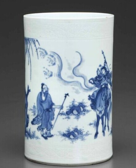 筆筒直腹,口和足的外沿暗刻紋飾,器身通景繪青花人物故事圖。一人騎馬馳至,與持拐老者交談。青花濃淡有致,色澤明快,繪畫(huà)細(xì)膩,人物刻畫(huà)生動(dòng)、布局合理,胎質(zhì)細(xì)膩。應(yīng)為一件不可多得之文房佳品。在翰墨飄香的中國(guó)傳統(tǒng)文化中,除了筆、墨、紙、硯文房“四寶”之外,還包括了很多的輔助文具,筆筒就是其中的一種。從明代起,制作精致的筆筒就成為文人雅士和收藏家的寵物。