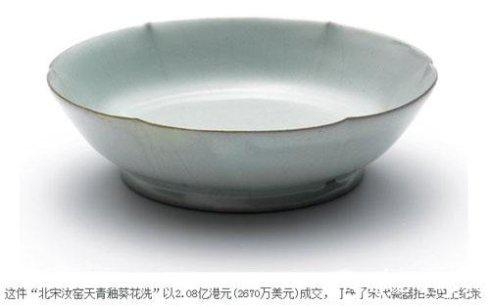 八、2012年4月5日香港蘇富比拍賣公司一件北宋汝窯天青釉葵花洗成交價(jià):2.08億港元(2670萬(wàn)美元),創(chuàng)下宋代瓷器拍賣的新紀(jì)錄。如下圖: