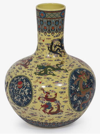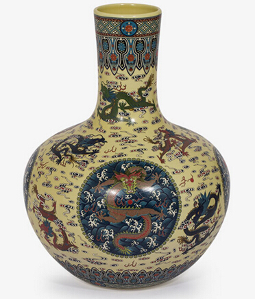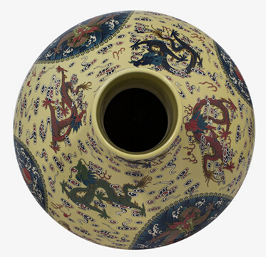 深圳鑫寶源提供的此件藏品,雍正款黃地粉彩龍紋天球瓶,圓口,頸部粗短,上闊下斂,球形腹碩大,砂底微凹。外口頸部布滿紋飾,腹部裝飾有云龍紋,云龍回首觀望,張口怒齒吐舌,奮爪騰飛,遒勁威武,一展叱咤風(fēng)云之態(tài)。鼻吻向上外翻,下顎胡須向后飛揚(yáng),兩鹿角壓低貼近向后飛揚(yáng)的數(shù)屢鬃鬢,神采奕奕,惟妙惟肖,鱗片描繪精細(xì),片片單獨(dú)暈染;顏色絢麗,濃淡相宜; 筆法細(xì)致,極為流暢,畫面生動(dòng)傳神,氣勢(shì)恢宏,一派皇家之勢(shì)。龍紋為中國傳統(tǒng)的吉祥紋飾,龍又進(jìn)一步演變成至尊的王權(quán)。腹部龍紋大氣磅礴,威猛雄壯,叱咤 風(fēng)云,是雄心勃勃要干一番大事業(yè)的皇帝的象征。存世極為罕見,公私典藏不過數(shù)例,極具收藏價(jià)值。