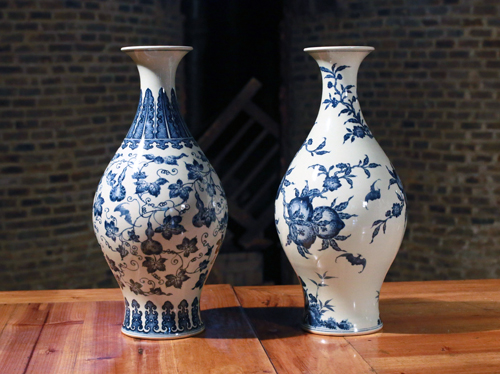 復(fù)燒成功的清代雍正青花桃蝠紋橄欖瓶(右)、清代雍正青花纏枝葫蘆飛蝠紋橄欖瓶(左)。(記者王東 攝)