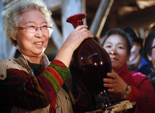 來(lái)自遼寧鞍山的游客杜金蘭女士高興地舉起剛出窯的瓷器拍照留念。(記者王東 攝)