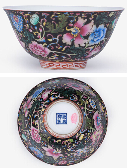 此藏品口沿微外撇,直壁,圈足,以烏金釉為地,其上又以粉彩繪畫“花卉”圖案,充分展現(xiàn)出康熙時期宮廷繁麗富貴之特色,此件粉彩作品即為康熙時期國力昌盛時所燒制,是頗受帝王喜愛的御窯宮廷陳設賞器,整體畫工精美,純凈瑩潤的墨彩和粉彩花卉的搭配相映成輝。施彩瑰麗濃艷,紋飾繁縟,盡顯清代宮廷華麗之風,底足內(nèi)有青花楷書“康熙年制”四字雙行款,堪稱康熙御瓷,保持完整,實屬少見之重器極為難得,相類似的作品在各大館藏及拍賣中罕見,極具收藏和投資價值。
