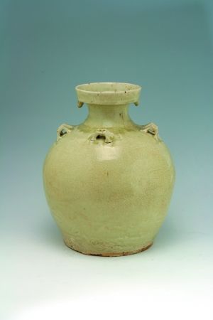 盤(pán)口、直頸、豐肩、園鼓腹、平底;盤(pán)口下對(duì)稱(chēng)有兩條小系,肩上四面有六條橋型系,呈兩雙兩單狀排列;通體施青釉,釉層肥厚潤(rùn)澤,開(kāi)有細(xì)密的深色紋片,積釉處呈綠色;平底無(wú)釉露淺灰色胎,胎質(zhì)較為酥松有孔洞。