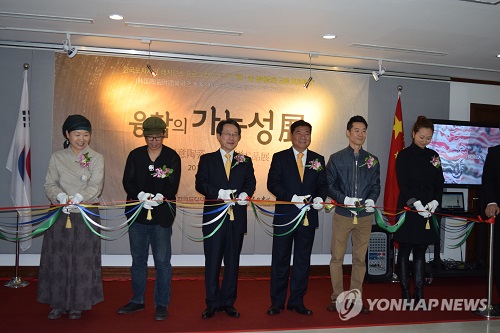 韓國陶瓷財團代表理事李完熙(左三)和首爾中國文化中心主任史瑞琳(右三)出席活動并剪彩。(韓聯(lián)社)