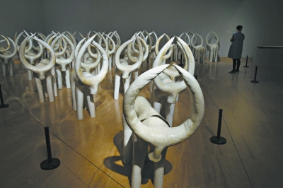法國(guó)藝術(shù)家雅克·考夫曼的作品張揚(yáng),且哲學(xué)意味濃厚。其中一個(gè)名為《于有形和無(wú)形之間》的作品,在展廳地面上鋪了許許多多大拇指肚大小的陶瓷“面疙瘩”。待參觀者蹲在地上細(xì)看,才發(fā)現(xiàn)有些“面疙瘩”上印著兵馬俑的臉,有些則僅僅是被捏出一點(diǎn)褶皺。幾百個(gè)這樣的“面疙瘩”組成一個(gè)巨大的圓,讓觀眾不由自主想要繞著它轉(zhuǎn)上幾圈。
