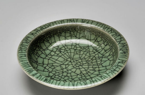 其二、"金絲鐵線"的紋樣,哥窯釉面有網(wǎng)狀開(kāi)片,或重疊猶如冰裂紋,或成細(xì)密小開(kāi)片("俗成百圾碎"或"龜子紋"),以"金絲鐵線"為典型,即較粗琉的黑色裂紋交織著細(xì)密的紅、黃色裂紋。明代《格古要論》中有這樣的描述:"哥窯紋取冰裂、鱔血為上,梅花片墨紋次之。細(xì)碎紋,紋之下也。"