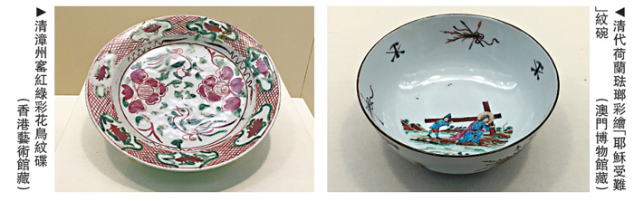明末清初,歐洲各國陸續(xù)來華尋求通商貿(mào)易。廣州作為通商口,外商必須通過廣州行商進(jìn)行貿(mào)易,澳門則成為廣州港的外港,再次促成廣州對(duì)外貿(mào)易的繁榮時(shí)期。十八世紀(jì)上半葉,中國商人在廣州設(shè)坊,專事上彩,并可供客人就地驗(yàn)貨,專供外銷,外商還可以來樣定製,這就是別具風(fēng)格的廣彩瓷!皬V彩”即“廣州織金彩繪瓷”的簡稱,此次展出的多件廣彩瓷多為碗、碟、瓶、盤、餐具,器型紋樣部分是西式的,圖案明顯帶裝飾性,色彩艷麗。這個(gè)時(shí)期的外銷瓷不僅品種豐富,在紋飾圖案的主題更加多樣化,以基督宗教為主題的瓷器就涵蓋《圣經(jīng)》中描述的事物、“耶穌會(huì)”章紋,以及神跡等。