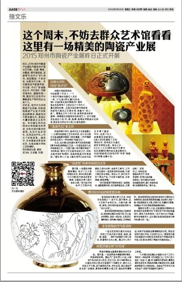 昨日,2015鄭州市陶瓷產(chǎn)業(yè)展在市群眾藝術(shù)館正式開展。白瓷、青瓷、水墨瓷、黃河澄泥硯、泥塑等作品共計(jì)100余件,造型精致、千姿百態(tài),充滿藝術(shù)之美。本次展覽由市委宣傳部、市文聯(lián)、市文廣新局聯(lián)合主辦,市文改辦、市群藝館承辦,展期持續(xù)一周,展品均出自我市從事陶瓷生產(chǎn)制作的企業(yè)和個(gè)人。