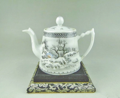 江邊看“寒江晚渡”。圖一是一只民國(guó)時(shí)期的雪景壺,和現(xiàn)在用的燒水壺有些類似,有壺把和壺嘴,壺高10厘米,口徑6.5厘米,身長(zhǎng)14.3厘米。這種壺有壺把可以手執(zhí),因此在古代也叫“執(zhí)壺”。壺身施以粉彩,展示的正是冬天的傍晚,降雪之后,寒江晚渡的情形。如果身臨其境,站在江邊,只見江天連成一片,迷迷蒙蒙,雪白茫茫,飛雪仍在緩緩飄落,四周一片凄迷。一只孤舟由江心緩緩駛向江岸。江邊的老樹上,枯草上,房頂上都落了雪,小徑被雪覆蓋,沒了道路,只有行人深深淺淺的腳印,走向遠(yuǎn)方。壺的另一邊有題款:“寒江晚渡照塔影”,“時(shí)在乙酉冬月,凌云作”。凌云字美材,齋名凌云軒,江西新建人,是清末民初很有名望的粉彩畫家,與“珠山八友”之首的王琦是同鄉(xiāng)而且私交甚好,頗受其影響。