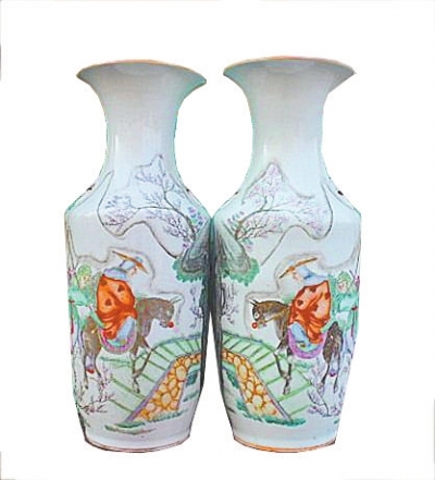 橋邊看“紅梅映雪”。圖二是一對(duì)民國(guó)時(shí)期的粉彩棒槌瓶,敞口,細(xì)頸,豐肩,圈足,因呈棒槌狀而得名。瓶高58厘米,口徑21厘米,底徑18厘米,瓶上的圖景是著名的“踏雪尋梅”圖。“踏雪尋梅”源自唐代詩(shī)人孟浩然,元代的劇作家費(fèi)唐臣在《貶黃州》中有“為生扭做踏雪尋梅孟浩然”之句,正是說