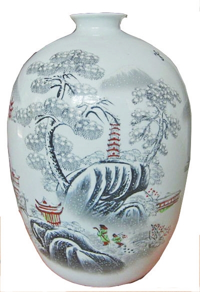 山間看“江山瑞雪”。圖三是一只民國(guó)時(shí)期的粉彩冬瓜罐,敞口,短頸,豐肩,束腹,圈足,因形似冬瓜而得名。罐高32.5厘米,口徑4.5厘米,底徑8.7厘米,罐上展現(xiàn)的正是“江山瑞雪”圖,只見莽莽蒼蒼的山間,有紅色亭臺(tái),七層高塔,有連在江上的回廊,山上青松蒼翠,紛紛瑞雪,飄落山間,一片潔白。一位頭戴斗笠的隱士,正在山間路上,仰首遠(yuǎn)眺,江山如畫,大地蒼茫。他身后的小童扛著一株紅梅,正隨他向前走。邊上有題款“江山瑞雪”,“辛巳年宜民作于景德鎮(zhèn)”。