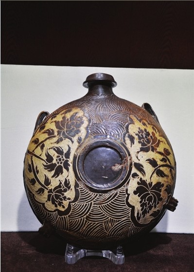 為讓記者全面地觀賞此物,趙志平特將此物固定在展示臺內(nèi)。該扁壺通體給人以開闊、明朗之感:高35cm,口徑6cm,腹徑33cm,小口,卷沿,短徑,腹部扁平,近口部有左右對稱的耳系;正反兩面中間均有一圈足,腹部圈足起放置平穩(wěn)的作用,正面圈足則起對稱加固胎體的作用;主體飾以圈足左右對稱的兩組牡丹花紋,周圍空間用弧弦刻紋填補;施褐釉,腹部不掛釉,灰胎,其剔刻線條流暢,造型質(zhì)樸,構(gòu)圖新穎。
