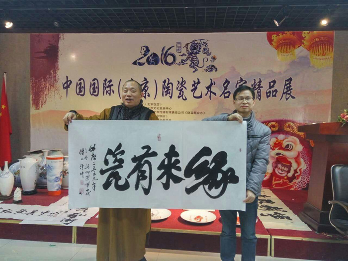 1月20日下午13時30分現(xiàn)場還進行了藝術(shù)家筆會活動,溈仰宗第十代傳人凈修法師和中華陶瓷網(wǎng)/博緣陶瓷總經(jīng)理柯維太先生進行了親切友好的互動,凈修法師還為博緣陶瓷現(xiàn)場題字:緣來有瓷。
