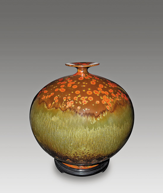 吳衛(wèi)光以曜變天目釉為例解釋:“在中國(guó)古代有很多很出名的窯址和窯系,很多人在追求對(duì)窯系的恢復(fù)和仿制。我的老師——廣州美術(shù)學(xué)院教授、廣東省工藝美術(shù)大師高永堅(jiān)是中國(guó)研究南宋官窯非常知名的一位大師。有評(píng)價(jià)稱南宋官窯青瓷工藝在廣州開(kāi)花結(jié)果,高永堅(jiān)研制的粉青紋片釉,釉色瑩潤(rùn),紋片中呈現(xiàn)冰花似的復(fù)雜層面而精彩至極。他怎么做呢?就是要搞清楚南宋當(dāng)時(shí)的配方和燒制的工藝,要盡可能達(dá)到當(dāng)時(shí)的水平,在這個(gè)基礎(chǔ)上才能創(chuàng)新。當(dāng)時(shí)高永堅(jiān)做的事情基本是用南宋的器皿來(lái)恢復(fù),做出來(lái)的作品跟南宋的作品很接近。從這個(gè)角度來(lái)看曜變天目釉的探索,我認(rèn)為是很有價(jià)值的。”
