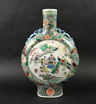 清光緒五彩飲中八仙抱月瓶,高38cm,抱月瓶的外形最早源自宋時期流行于西夏的陶制馬掛瓶,左右雙系,用以掛于馬鞍之側(cè),極具民族特色。明代以青花為裝飾,結(jié)合抱月瓶自身的獨特風(fēng)格,發(fā)展成為陳設(shè)用藝術(shù)品。抱月瓶以永宣時期最負盛名。此件五彩飲中八仙抱月瓶整體造型張弛有度,端莊秀麗,線條自然流轉(zhuǎn)。外繪五彩飲中八仙圖,畫工細膩。