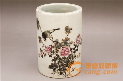 圖一:“喜鵲報(bào)春”粉彩筆筒(民國(guó))
