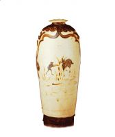 瓶高63cm,口徑7.8cm,足徑13cm。瓶唇口外撇,短頸,豐肩,直腹,寬圈足,沙底。瓶肩部繪一周黑彩花瓣紋,兩組下垂卷葉紋如垂蔓一般將瓶腹分為兩幅畫面:一幅是小猴立行在泛著漣漪的水邊似在張口呼喚,小鹿則駐足點(diǎn)點(diǎn)蘆葦旁觀望;另一幅是飛翔的雙雁掠過水面欲落覓食。
