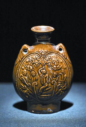 這件褐綠釉印花人物紋扁瓶的形制、紋飾與1971年河南安陽洪河屯北齊驃騎大將軍范粹墓出土的幾件黃釉印花人物紋扁瓶相似。另外,河北邢窯北朝遺址也出土過這種產(chǎn)品。