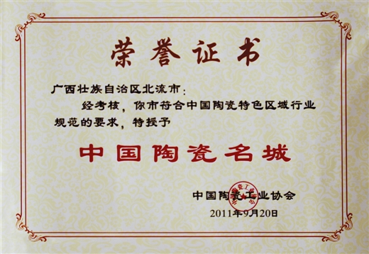 北流市被中國陶瓷工業(yè)協(xié)會評定為“中國陶瓷名城”。