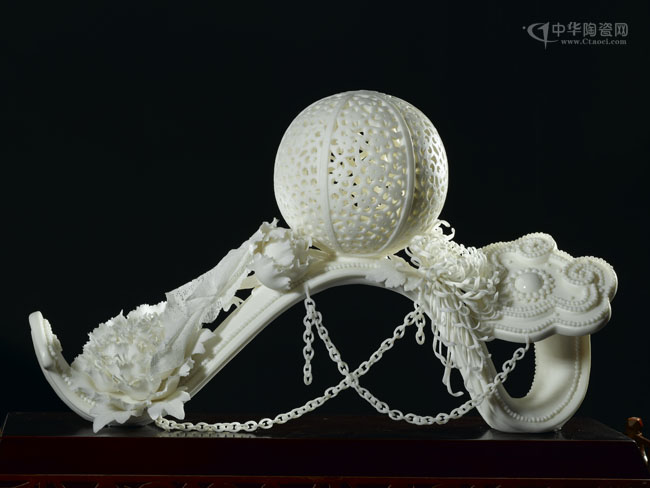 蘇志強的作品《圓滿如意》就是揉合中華傳統(tǒng)文化的元素,以如意棒為主體,圓球代表圓滿,蘊含著“萬事如意”、“美美滿滿”的美好意象。作品純手工制作,精雕細(xì)刻,造型和諧,用璀璨的瓷花襯托柔軟鏈條的動感,剛?cè)嵯酀?jì),松密結(jié)合,令人賞心悅目。作品并以德化特有的溫潤如玉的“中國白”為胎質(zhì),潔白細(xì)膩,素凈淡雅。