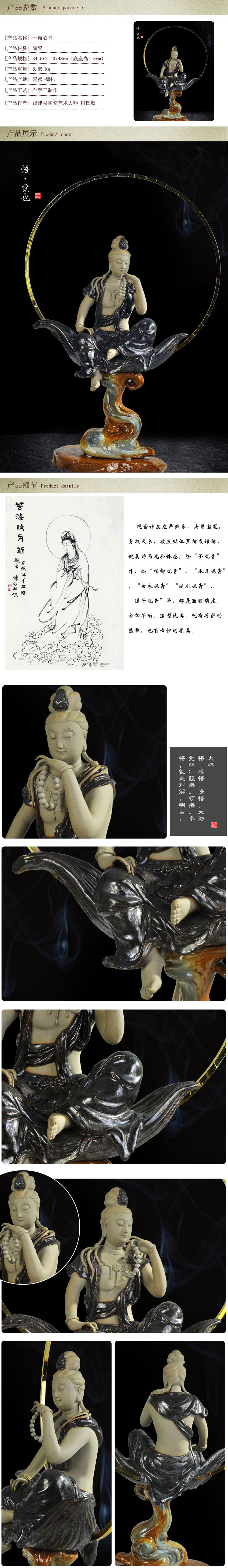 走進(jìn)坤恒工藝品有限公司鳳翥堂展廳,一尊祥云觀音很快就吸引了我們,這尊觀音造型優(yōu)美,微妙傳神,極具藝術(shù)魅力,尤其令人眼睛一亮的是,這尊金屬釉變觀音打破了傳統(tǒng)白瓷觀音塑像的印象,素色皮膚掩映在黑色披衣中,衣裙呈褶皺狀,下部衣擺翻卷,似迎風(fēng)飄動(dòng),神態(tài)自然慈祥俊美。