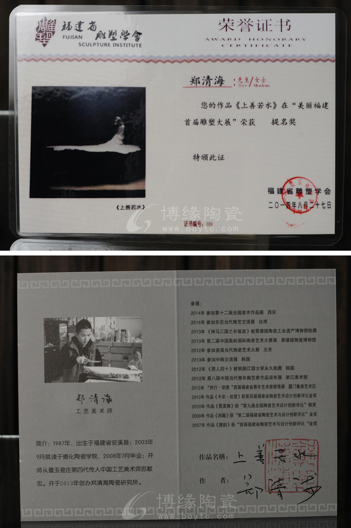 2013年10月,作品《平安•如意》獲第四屆福建省陶瓷藝術(shù)設(shè)計(jì)創(chuàng)新評(píng)比金獎(jiǎng),作品《神馬三國之長坂坡》被景德鎮(zhèn)陶瓷工業(yè)遺產(chǎn)博物館收藏;