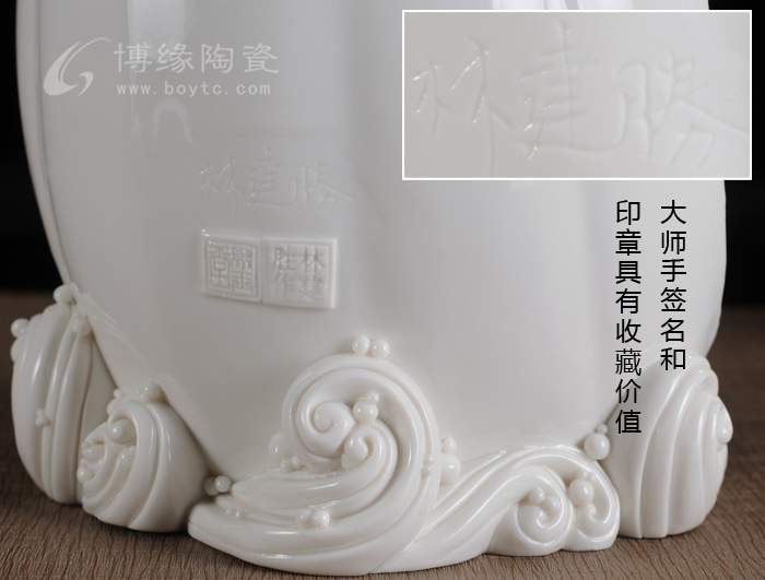 鬼斧神工的雕塑技藝,又有世界名貴的稀有材料、完美無瑕的燒制工藝的加持,使得林建勝的瓷塑作品深得收藏界的青睞。近十年來,他的瓷塑作品價格至少翻了10倍以上。眼下,林建勝無論閱歷、眼力還是智力、體力都是人生的巔峰時刻,是藝術(shù)家創(chuàng)作成熟時期與黃金時期,收藏界深諳林建勝的瓷塑作品升值速度快,升值空間大,市場前景無量,因此,中國收藏家協(xié)會授予林建勝“中國收藏家喜愛的陶瓷藝術(shù)大師”榮譽稱號。