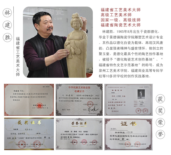 林建勝,男,1965年8月出生,福建德化人,景德鎮(zhèn)陶瓷學院雕塑藝術(shù)設(shè)計專業(yè)畢業(yè),高級工藝美術(shù)師,國家一級/高級技師,福建省美術(shù)家協(xié)會會員,中國收藏家喜愛的陶瓷藝術(shù)大師,福建省工藝美術(shù)大師,福建省陶瓷藝術(shù)大師,福建省技術(shù)能手,德化聚玉堂藝術(shù)總監(jiān)。