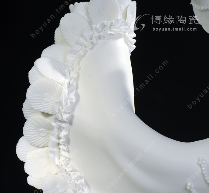 作品《聽濤》經(jīng)由工藝美術師蘇志強親手設計創(chuàng)作,以德化溫潤如玉的建白瓷為胎體,瓷質潤如脂、晶瑩碧剔。作品中以一少女為主角,一手撫耳,作聽裝,一手持斗笠,表現(xiàn)少女的勤勞的品性,姿態(tài)婀娜,楚楚動人。作品精雕細刻,在璀璨瓷花的襯托下,更顯得作品人物形象栩栩如生,妙不可言。作品造型線條流暢、情境與人物表現(xiàn)得生動而活潑,是純手工制作的辦公擺件、居家、禮品收藏瓷。