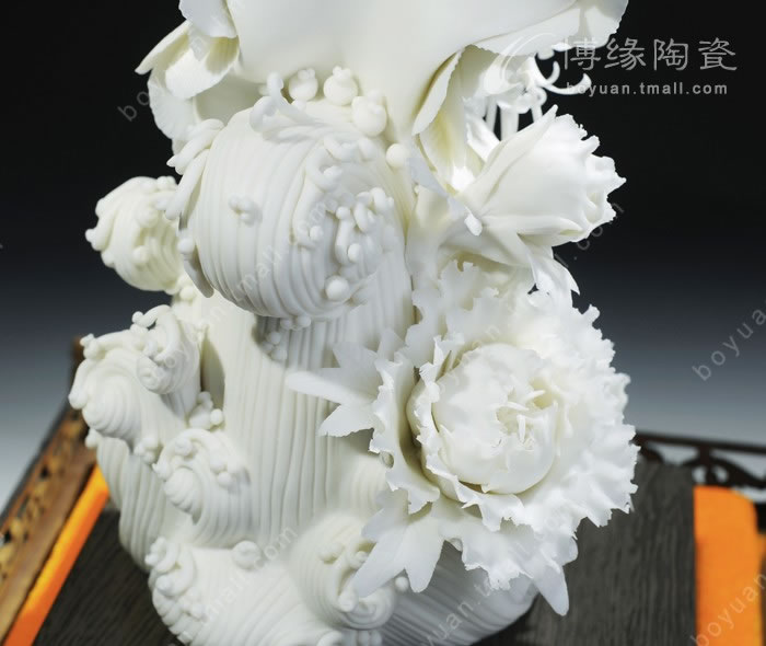 蘇志強善于揉合中華傳統(tǒng)文化的諸多元素,在瓷塑作品中取如意為主體,配以葫蘆,構思簡單明了,主題“百福如意”呼之欲出。作品并以雍容華貴的牡丹、嬌艷欲滴的玫瑰點綴其間,展現(xiàn)一派欣欣向榮的景象,蘊含著祥瑞吉慶之意。