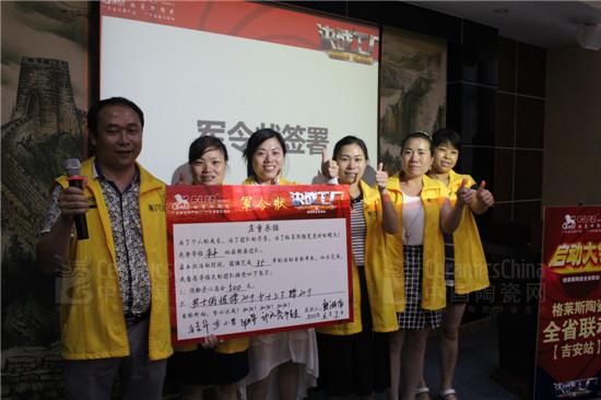 作為格萊斯陶瓷西南區(qū)域的重要區(qū)域之一,此次聯(lián)動(dòng)受到了廠家的高度重視,經(jīng)過(guò)一個(gè)多月的前期溝通和準(zhǔn)備,廠商通力配合,【決戰(zhàn)工廠】第二季格萊斯陶瓷江西全省聯(lián)動(dòng)(吉安地區(qū))順利啟動(dòng)。格萊斯陶瓷西南大區(qū)經(jīng)理曾穎在本次啟動(dòng)大會(huì)的致辭中作出了廠家的承諾,由廠家監(jiān)督整個(gè)聯(lián)動(dòng)活動(dòng),號(hào)召各銷售精英把優(yōu)惠帶給更多業(yè)主,并針對(duì)這次活動(dòng)做出了清晰明確的工作指導(dǎo),使參與活動(dòng)的銷售精英的步伐更為堅(jiān)定不移。各小組代表充滿斗志地簽下軍令狀,這標(biāo)志著活動(dòng)正式啟動(dòng)!