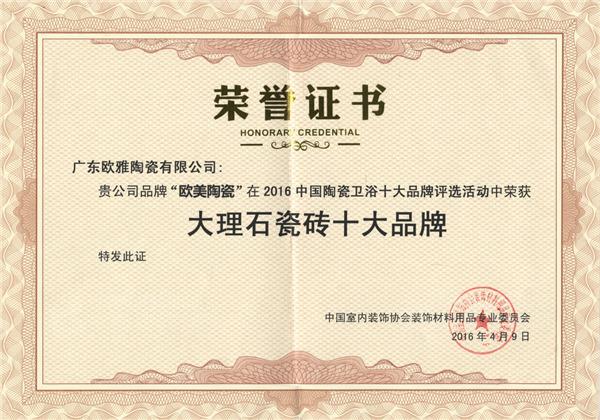 歐美陶瓷憑借卓越的品質(zhì)、優(yōu)秀的服務(wù)、先進(jìn)的設(shè)計理念,亦贏得了專業(yè)人士和消費者的一致認(rèn)可。2016年,歐美陶瓷先后榮獲中國房地產(chǎn)500強(qiáng)開發(fā)企業(yè)500強(qiáng)首選住宅陶瓷系統(tǒng)服務(wù)商、2013-2015年度時代地產(chǎn)優(yōu)秀供應(yīng)商稱號、中國陶瓷十大品牌、中國大理石瓷磚十大品牌殊榮、廣東省著名商標(biāo)、國家強(qiáng)制性產(chǎn)品“3C”認(rèn)證、中國綠色建筑陶瓷推薦產(chǎn)品、國際知名品牌、中國輕工業(yè)陶瓷行業(yè)(瓷磚)十強(qiáng)企業(yè)等多項榮譽,這無疑又是一個實力的見證。在廣東歐雅陶瓷集團(tuán)全力推動下,更加彰顯企業(yè)的雄厚實力與社會形象。