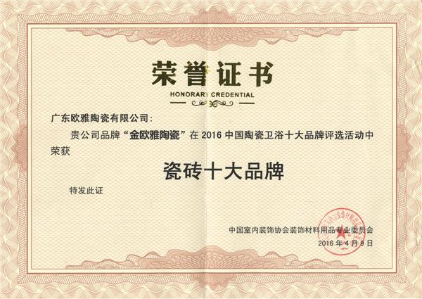金歐雅陶瓷榮獲瓷磚十大品牌稱號(hào)