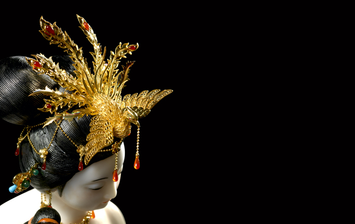 同時(shí),仕女身上的黃金珠寶飾物也在精心打造中。發(fā)釵、手鐲、項(xiàng)鏈、耳環(huán)、紈扇等珠寶首飾,均是花絲為骨,黃金為原料,用掐、填、攢、焊、堆壘等技法編結(jié)成型;再以鑲嵌作飾,用挫、鎪、捶、悶、打、崩、擠、鑲等技法,將金屬片做成托和爪子型凹槽,鑲以寶石。完成后的飾物再一一精心佩戴在瓷雕仕女上,因此都是活動(dòng)、可拆卸的。