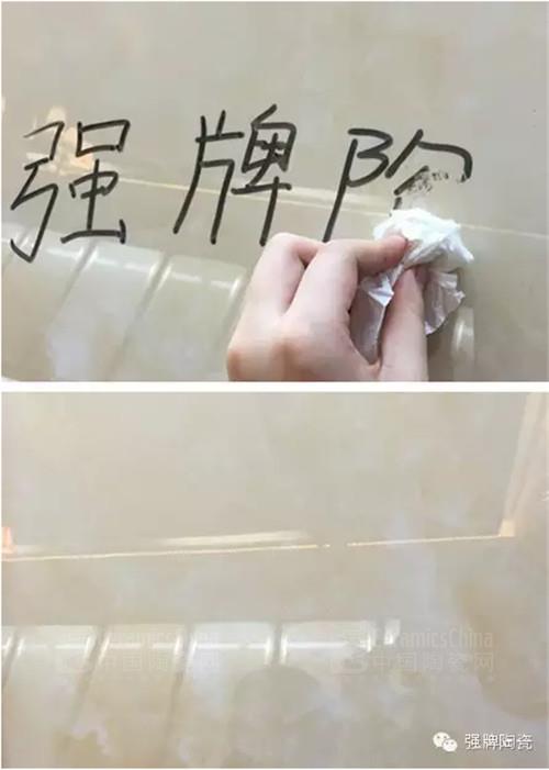 零吸污:強(qiáng)牌金剛釉II代產(chǎn)品成熟的二次燒超晶技術(shù)讓坯底更硬,物理性能更穩(wěn)定,更不易吸污。我們用記號筆在金剛釉II代產(chǎn)品表面隨意寫了幾個大字,隨后用抹布輕輕一擦,瓷磚表面又光潔剔透,污漬不會滲透到瓷磚表面,抗污性能良好。