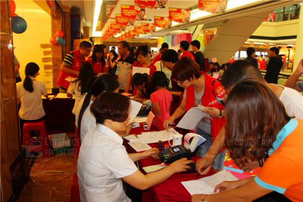 品嘗完意利寶陶瓷為業(yè)主們準(zhǔn)備的精心佳肴,欣賞完精彩的表演節(jié)目后,下午1點(diǎn)整,當(dāng)主持人宣布購磚活動開始時,業(yè)主們早已按捺不住心中熊熊燃燒的購磚之火,到處可見業(yè)主們?nèi)宄扇壕墼谝黄鸶`竊私語商量討論著選購哪款瓷磚,迫不及待紛紛搶購下定,導(dǎo)購區(qū)、收銀區(qū)工作人員忙得不亦樂乎,簽單不斷。