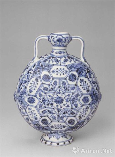 青花花卉錦紋雙耳扁瓶,明永樂(lè),高24.3cm,口徑3.5cm,足徑7.4cm。瓶蒜頭口,束頸,圓形扁腹。口肩連以對(duì)稱的如意耳,腹兩側(cè)正中各凸飾一乳釘紋,璧形底足,無(wú)款識(shí)。瓶口邊繪如意紋,腹部紋飾以六角星開(kāi)光向四周伸展構(gòu)成六邊形錦式開(kāi)光,開(kāi)光內(nèi)繪折枝花、纏枝花、朵花、團(tuán)花、江崖海水等紋飾,足邊繪朵梅紋一周。此瓶造型仿自阿拉伯銅器,紋飾的題材與布局都具有西亞風(fēng)格。