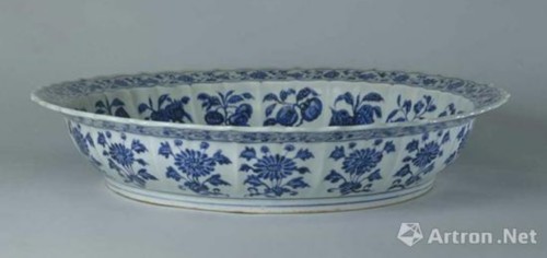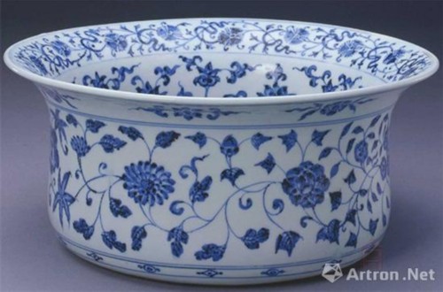 青花纏枝花紋折沿盆,明永樂(lè),高13.9cm,口徑31.6cm,底徑21.5cm。盆折沿,腹垂直,平底露胎。里外青花裝飾。盆里沿繪纏枝花一周,內(nèi)壁繪纏枝花7朵,盆底繪回紋一周,回紋內(nèi)繪八瓣團(tuán)花,花瓣呈變形蕉葉紋,紋內(nèi)又繪暗八仙。盆外沿繪折枝花卉8朵,外壁繪纏枝花卉7朵,底邊繪變形朵花紋一周。外底素胎無(wú)釉。無(wú)款識(shí)。此盆青花呈色濃艷,有暈散現(xiàn)象,為蘇泥勃青料所致。紋飾繁復(fù)生動(dòng),層次分明,是永樂(lè)時(shí)期受西亞國(guó)家金銀器的影響而創(chuàng)燒的一種新器型。