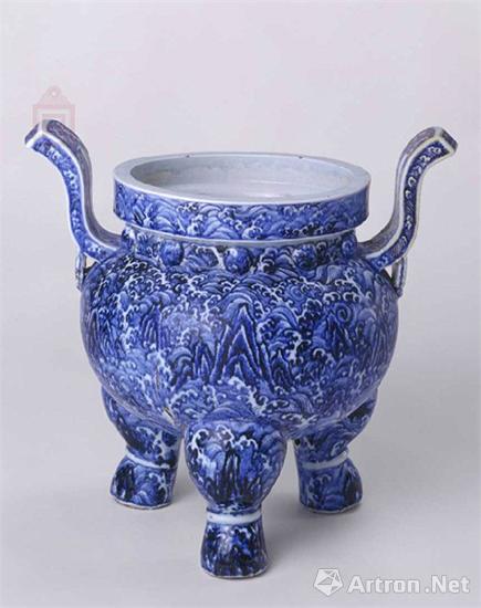 青花纏枝花紋罐,明永樂(lè),高17cm,口徑14.4cm,足徑9cm。罐直口,溜肩,鼓腹,小圈足。通體青花裝飾。頸上繪卷草紋,肩、圈足外墻均繪海水紋,腹部繪纏枝花紋,近足處繪如意云頭含靈芝紋。圈足內(nèi)施白釉。無(wú)款識(shí)。此器造型新穎,紋飾繁密,描繪細(xì)膩,形制和紋飾均受到伊斯蘭文化的影響。