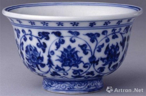 青花壓手杯(花心),明永樂(lè),高4.9cm,口徑9.2cm,足徑3.9cm。杯體如小碗狀,口微撇,折腰,豐底,圈足。內(nèi)外均繪青花紋飾。杯心有葵花一朵,花心署青花篆體 “永樂(lè)年制”四字款。外壁口沿下繪朵梅,腹部繪纏枝蓮紋。壓手杯是明代永樂(lè)時(shí)期景德鎮(zhèn)御窯廠創(chuàng)制的新型瓷杯。此杯制作精細(xì),形體古樸敦厚,青花色調(diào)深翠。壓手杯的特點(diǎn)為胎體厚重,重心在杯的下部,口沿微微外撇,手握杯時(shí),正壓合于手的虎口處,給人以沉重壓手之感,故有“壓手杯”之稱。明代永樂(lè)青花壓手杯是明代瓷器中能與文獻(xiàn)記載相互印證的一種實(shí)物,具有重要的研究?jī)r(jià)值。明人谷應(yīng)泰撰《博物要覽》一書(shū)中特別提到了這種杯:“若我永樂(lè)年造壓手杯,坦口,折腰,砂足滑底。中心畫(huà)有雙獅滾球,球內(nèi)”大明永樂(lè)年制“六字或四字篆書(shū),細(xì)若米粒,此為上品;鴛鴦心者次之;花心者又其次也。杯外青花深翠,式樣精妙,傳世可久,價(jià)亦甚高。”在故宮博物院的藏品中,有雙獅繡球內(nèi)書(shū)年款和花心內(nèi)書(shū)年款的永樂(lè)青花壓手杯。另有杯心為鴛鴦臥蓮圖案者,系明萬(wàn)歷時(shí)期仿制。此種品質(zhì)精良且?guī)в杏罉?lè)年款的壓手杯,據(jù)目前掌握的資料看,僅故宮博物院收藏有4件。