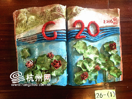 陶藝是一門優(yōu)雅的藝術(shù),每一件作品都有與眾不同的意義,孩子們對(duì)作品的呈現(xiàn)更是讓人眼前一亮。泥土給人一種厚重感,而公益中學(xué)的張雨嫣的作品《印象G20》以一本書的形式呈現(xiàn),十分輕巧。“我想到用書來表現(xiàn),是覺得它能體現(xiàn)出杭州深厚的文化底蘊(yùn),書上的內(nèi)容由G20LOGO、荷花、三潭印月、連綿的群山等元素組成,描繪西湖的美麗風(fēng)景。”張雨嫣說道。