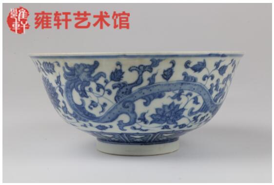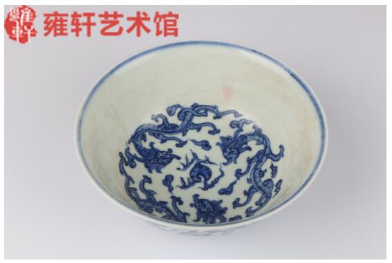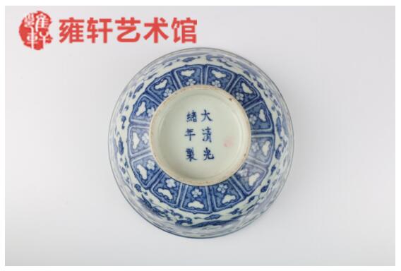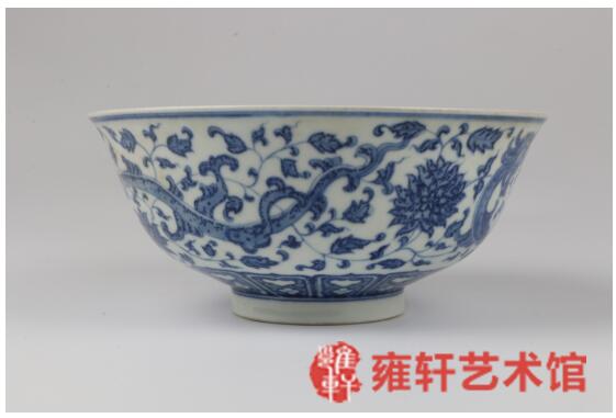 雍軒藝術館最近有幸征集到一款大清光緒款“青花纏枝花卉龍紋碗”,藏品高:8.5cm,口徑:20cm。藏品通體飾以青花,胎土精細,釉汁均凈,造型工整,凝重渾厚,胎質細膩,細砂底,整體風格是雄偉渾厚,莊重古樸。裝飾手法豐富,繪畫講究恢宏壯闊,具有很強的藝術感染力。碗身上纏枝花卉描繪得非常流暢,線條粗獷,自由活潑,畫法布局根據器型講究變化,青花云龍紋畫工展現夔龍靈活多變又有靈氣的規(guī)律性,顯示了當時裝飾藝術的高超及繪畫功力的嫻熟。